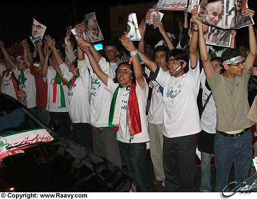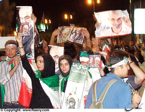 تقریبا طرفداران همه نامزدها بودند. غیر از رضایی و مهرعلیزاده که آنشب و آنجا تبلیغی ندیدم ازشان. لاریجانی هم خیلی کم. چند نفر هم دستمال یزدی برداشته بودند و جلوی ماشین ها را میگرفتند و شیشه هاشان را پاک میکردند و میگفتند: "به احمدی نژاد رای بدید" و میخندیدند. طرفداران قالیباف هم بودند، اما فقط معیین و هاشمی بودند که آنشب به طور ستادی و وسیع تبلیغات میکردند.